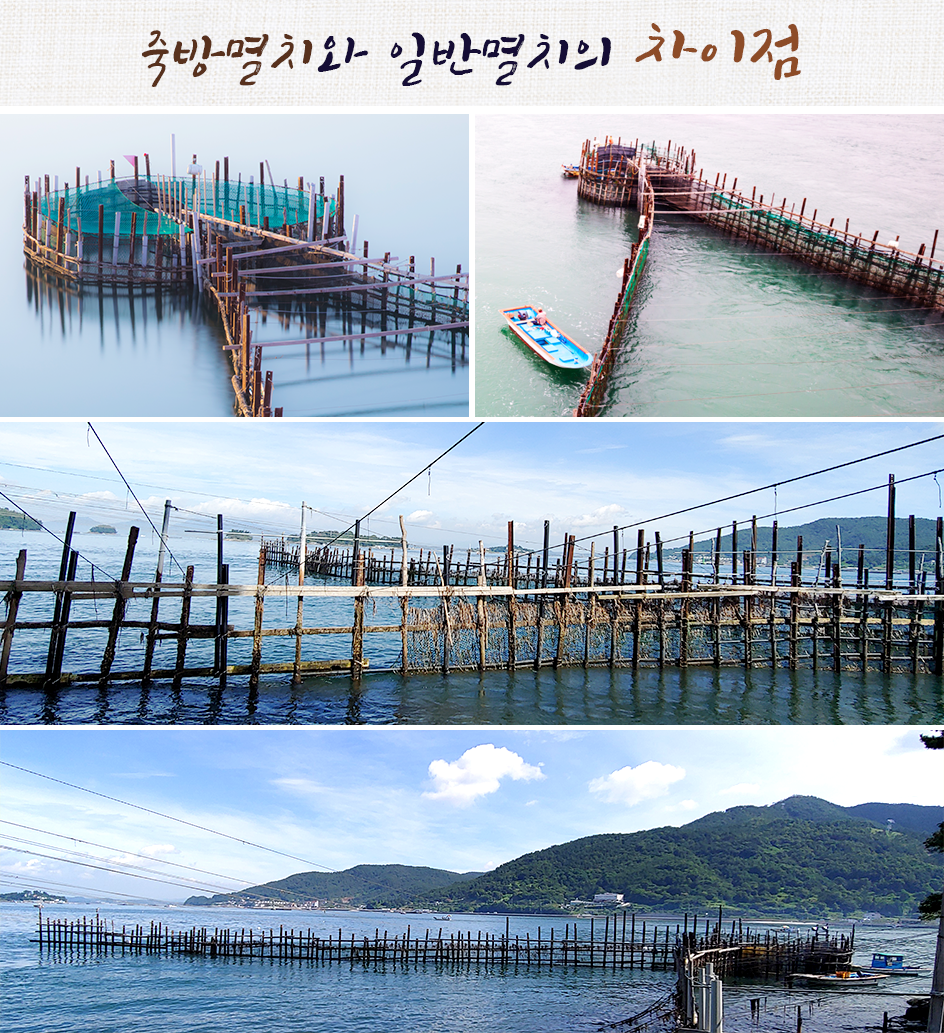 죽방멸치는 ‘죽방’이라는 대나무로 만든 부채꼴 모양의 말뚝을 통해 멸치를 잡는데서 유래한 말입니다.