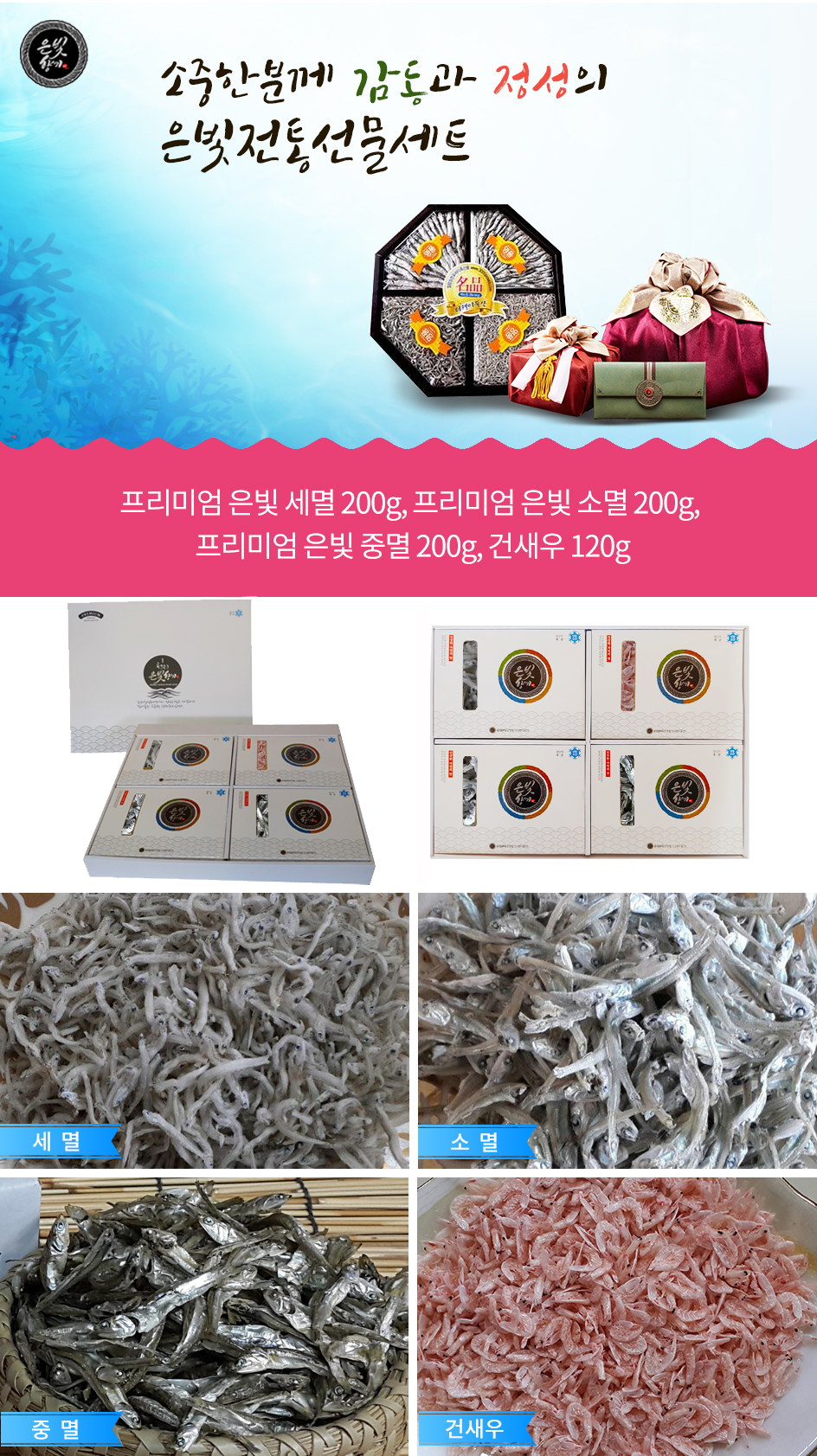 친환경 전통은빛멸치는 은빛 비늘을 그대로 간직하였으며 재건조하여 일반멸치보다 비린맛을 제거한 명품 전통멸치 선물세트입니다.
